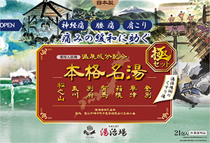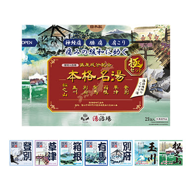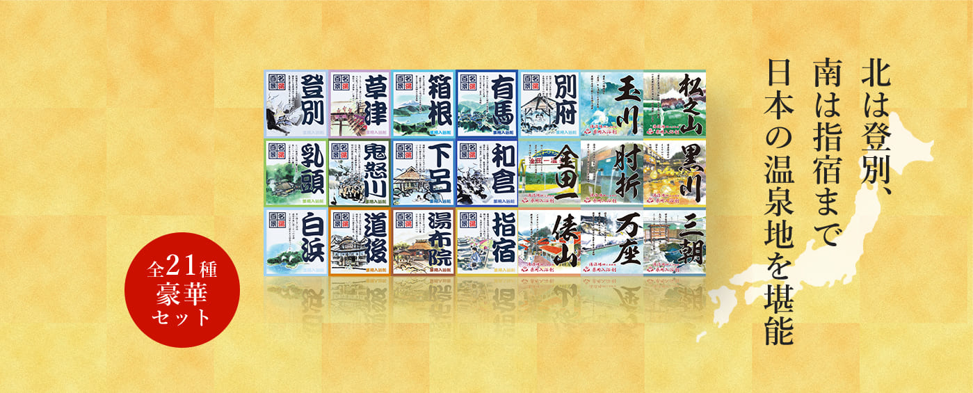 全国の人気温泉地から名だたる名湯を厳選した、全21種の薬用入浴剤です。