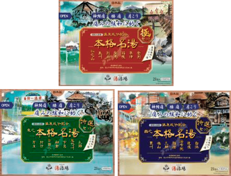 全国の人気温泉地から名だたる名湯を厳選した、全21種の薬用入浴剤です。