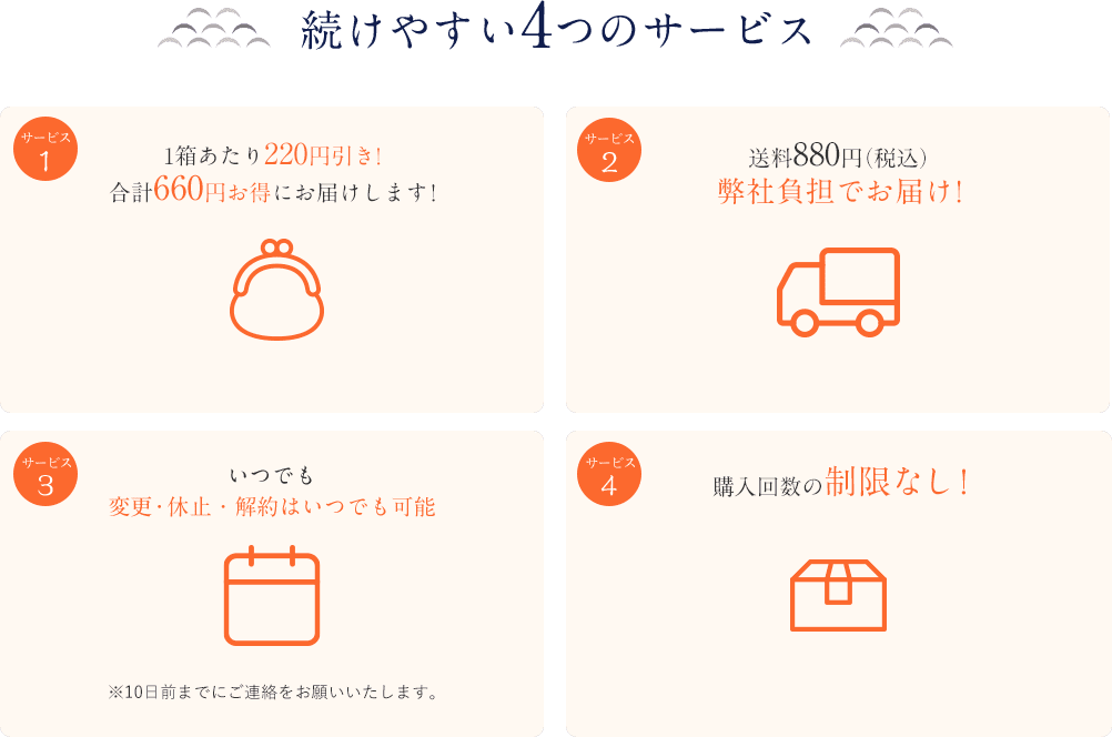 ・お届け日の変更や休止、ご解約される場合は、次回お届け予定日の10日前までに必ずお電話ください。