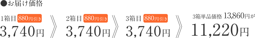 3箱すべて、通常価格の220円お値引きし3,740円、お支払い総額は11,220円となります。(送料は弊社負担にてお届けいたします。)